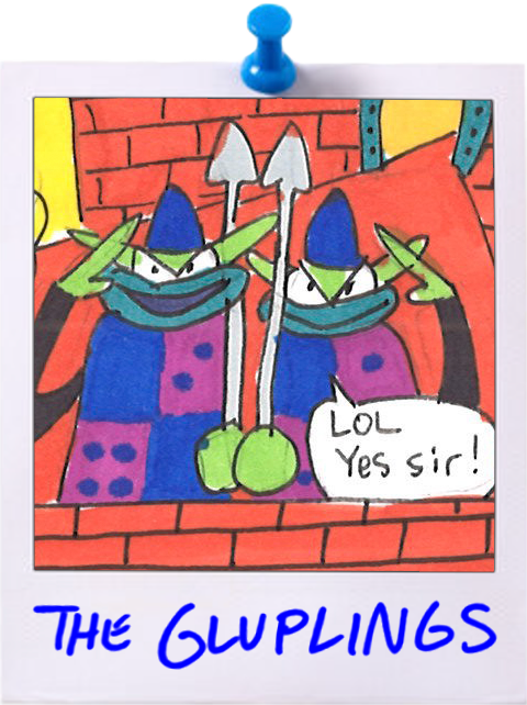 The underlings/employees of Malevolent Evil, the Gluplings are fiercely loyal to their boss per Article V sec. 2b of the collective bargaining agreement. They are fearsome and avid tourists.